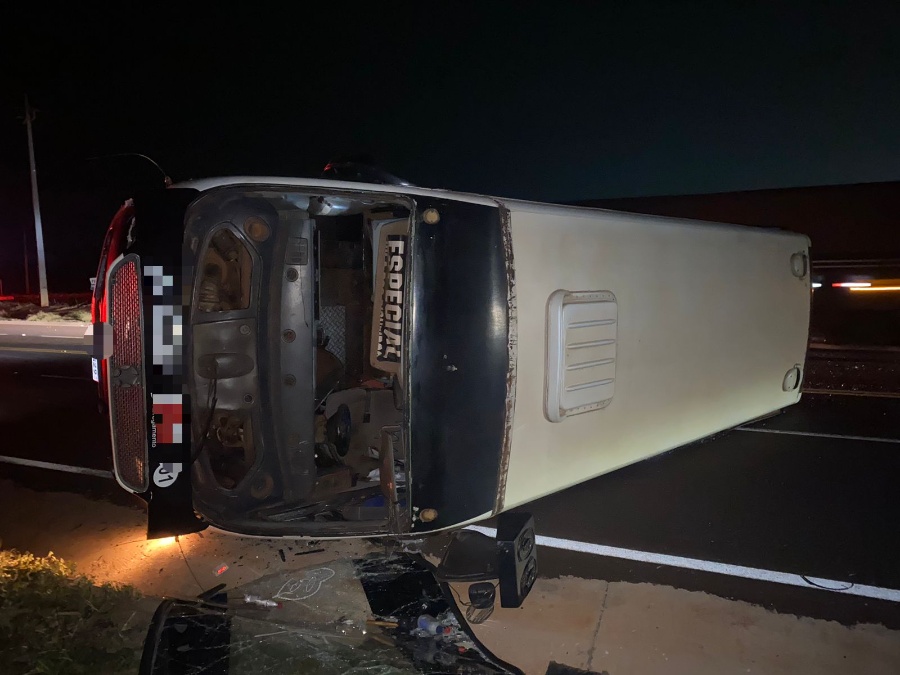 Com a batida, o micro-ônibus tombou sobre a rodovia.