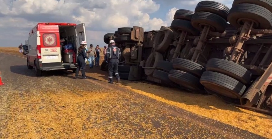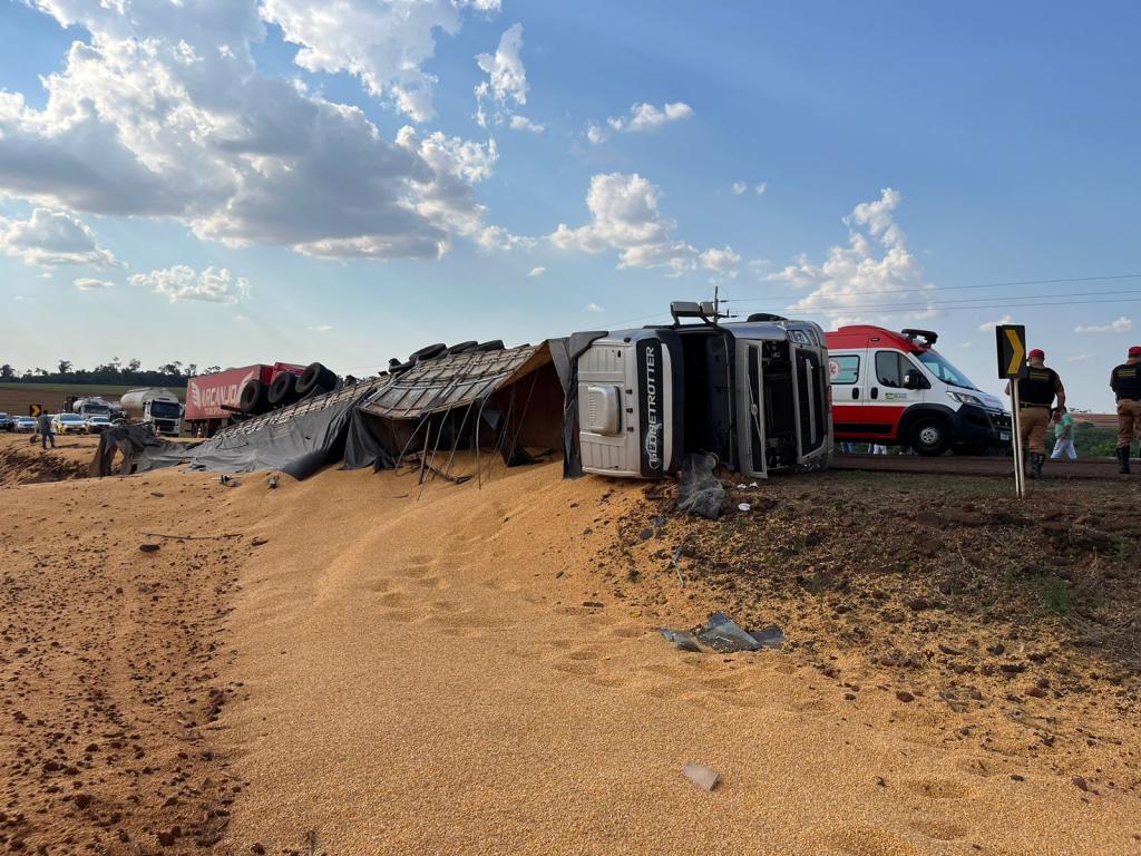 Conforme informações, uma mulher de 31 anos morreu no acidente que envolveu uma carreta. O bitrem, carregado com milho, tombou em uma curva, deixando a carga espalhada.