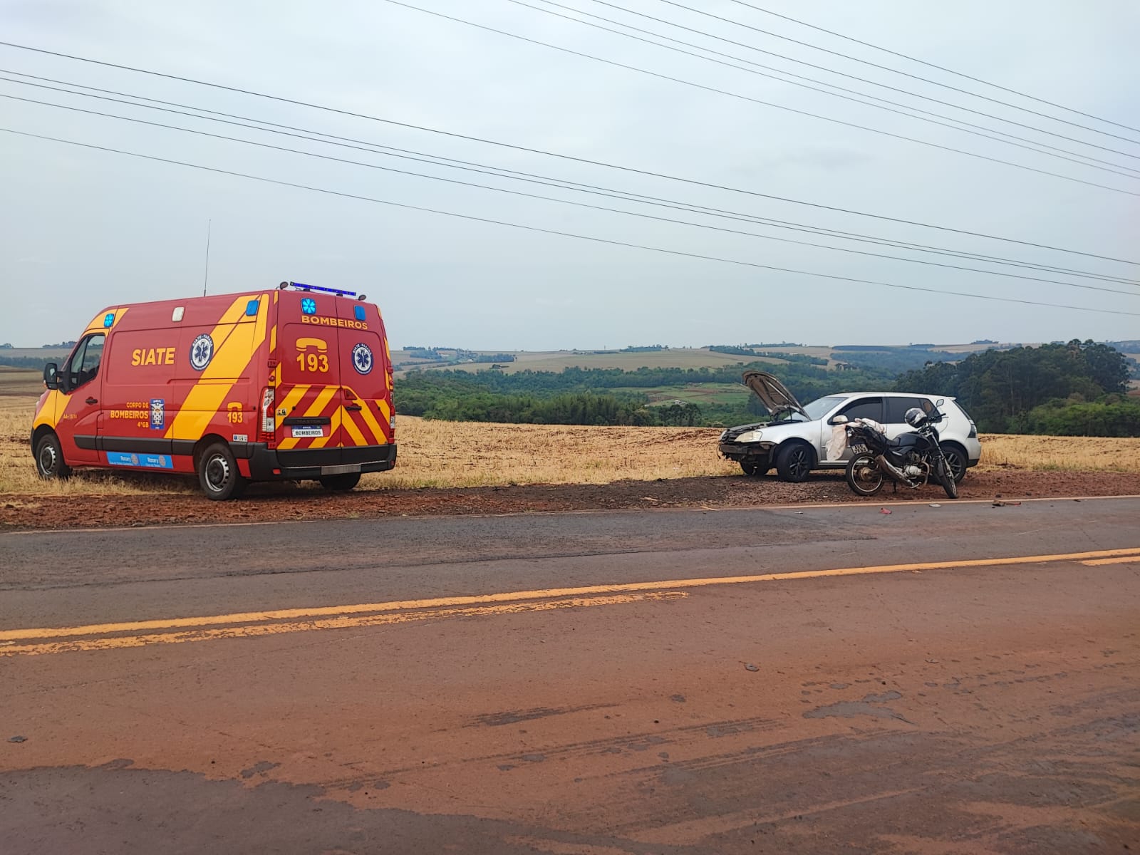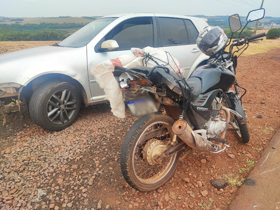 Conforme apurado no local, o condutor de uma moto seguia no sentido Toledo quando foi atingido na traseira por um Ford Ka branco que vinha na mesma direção. Com o impacto, a moto invadiu a pista contrária e colidiu com um Golf que trafegava no sentido oposto.