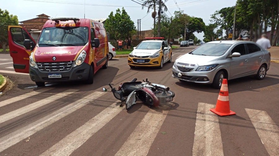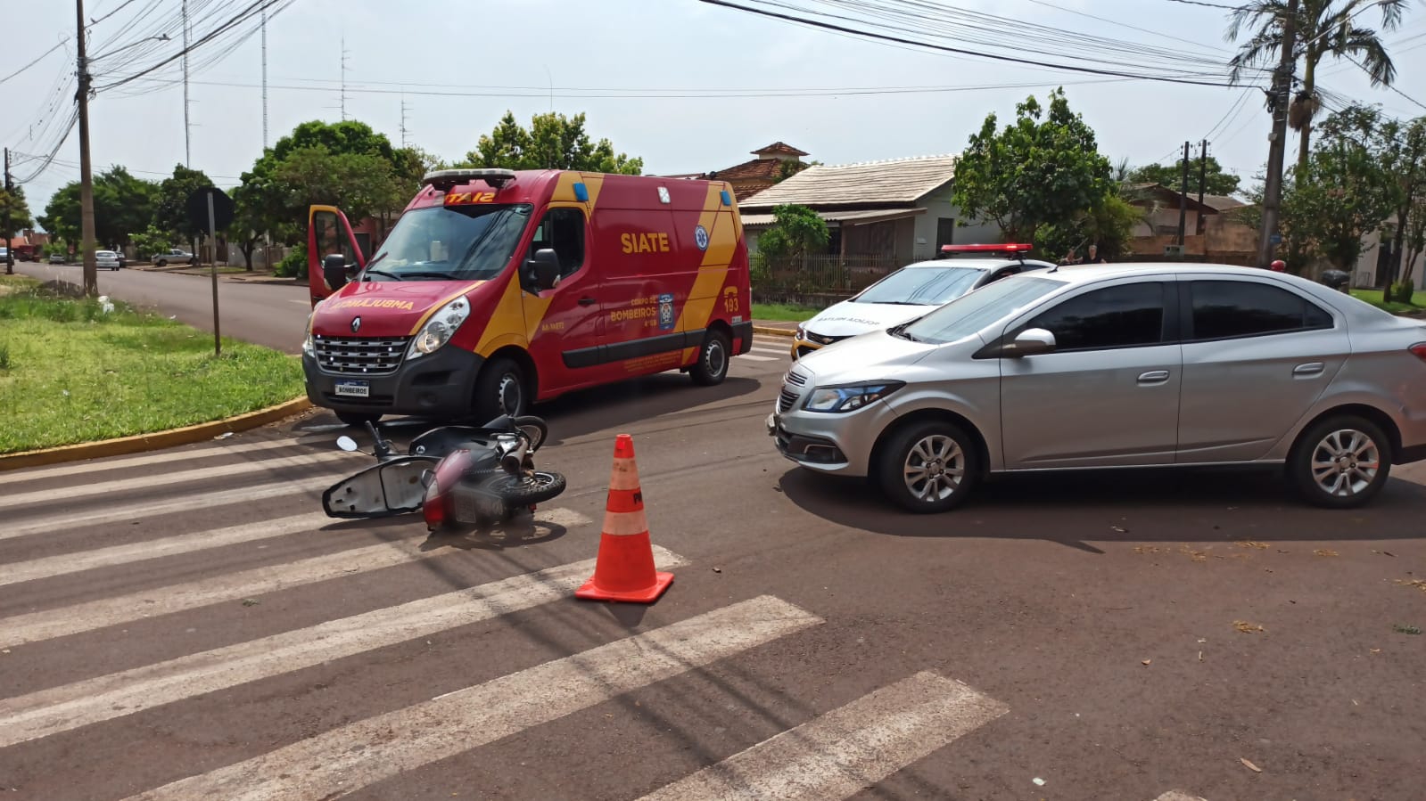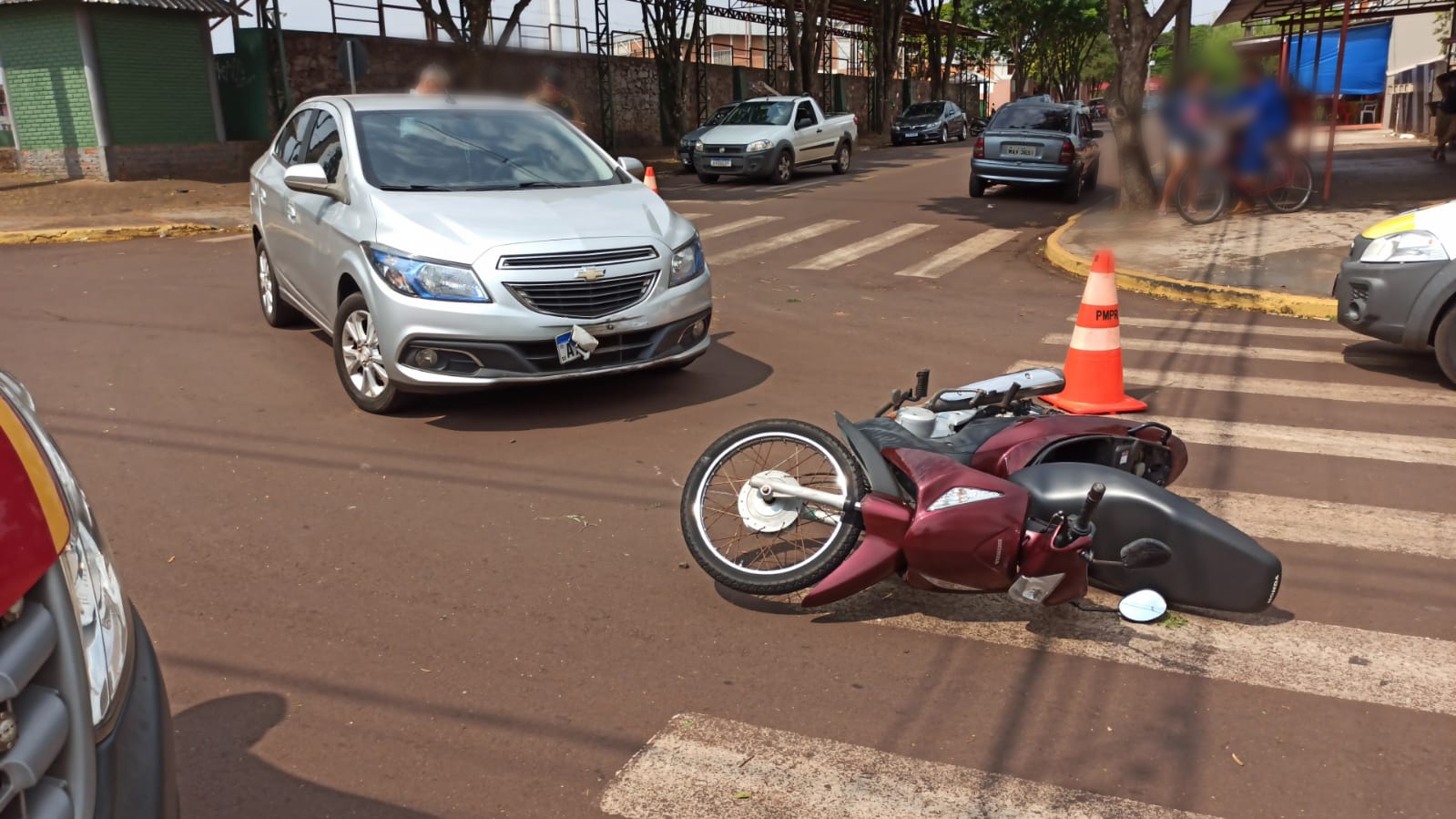 No começo da tarde desta terça-feira (17), uma colisão entre uma motocicleta Honda Biz 125, de cor vermelha, e um GM Prisma, de cor prata, deixou uma mulher de 39 anos ferida.