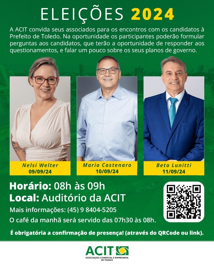 A Associação Comercial e Empresarial de Toledo (ACIT) realizará nos dias 9, 10 e 11 de setembro, o ‘Encontro com Candidatos’. O momento será um espaço aos candidatos ao cargo de Prefeito Municipal de Toledo, e a candidata ao cargo de Prefeita para que falem de suas propostas e ouçam as intenções da entidade e de seus associados.