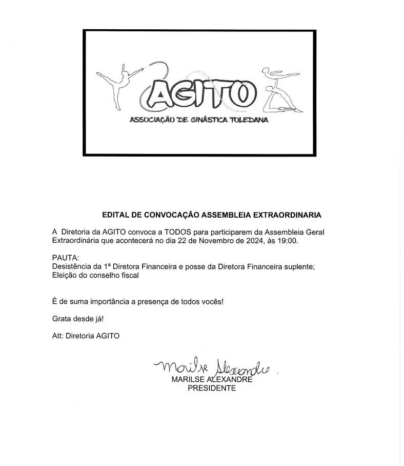 A Associação de Ginástica Toledana (AGITO) convocou todos os seus associados para uma Assembleia Geral Extraordinária, a ser realizada no dia 22 de novembro de 2024, às 19h. A reunião ocorrerá com uma pauta específica, que inclui a desistência da atual primeira diretora financeira, seguida pela posse da suplente, além da eleição para o conselho fiscal.