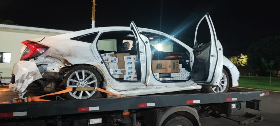 Uma fuga policial de 20 quilômetros terminou com a apreensão de uma grande quantidade de cigarros de origem estrangeira na noite de segunda-feira (04). A ação começou quando equipes da Agência Local de Inteligência da Polícia MIlitar de Toledo e da PRF avistaram um veículo com faróis apagados e peso excessivo trafegando pela rodovia em direção a Toledo.