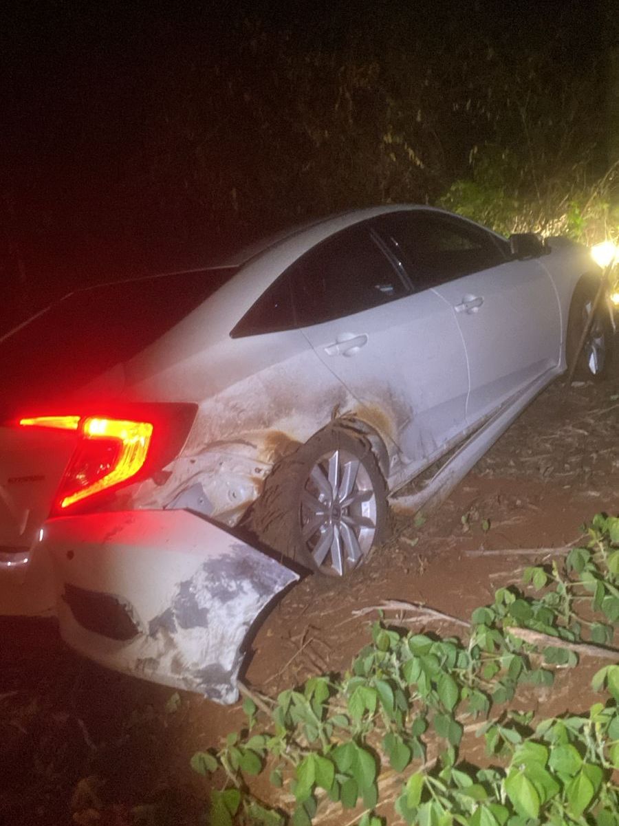 A fuga terminou quando o condutor perdeu o controle do veículo, entrando em uma plantação de soja e abandonando o carro após a colisão com árvores. O condutor não foi localizado.
