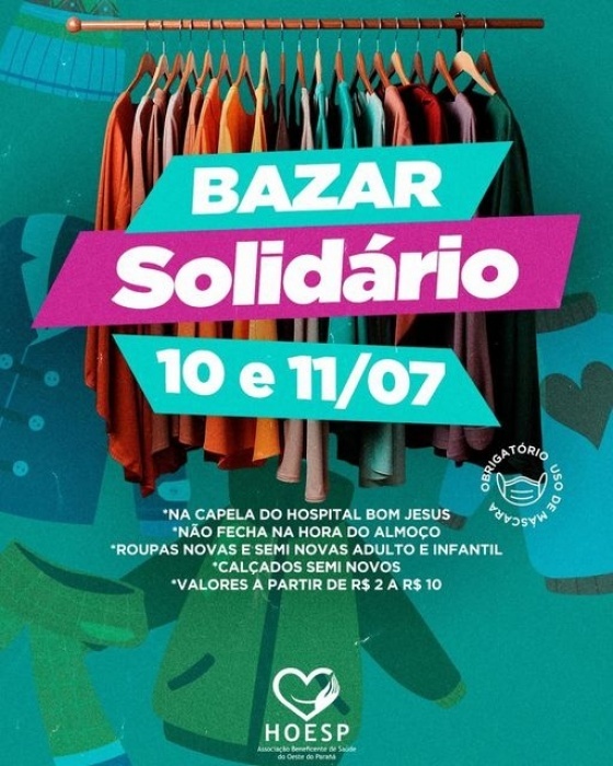 O Hospital Bom Jesus, mantido pela Associação Beneficente de Saúde do Oeste do Paraná (Hoesp), realiza um Bazar Solidário nesta quarta e quinta-feira (10 e 11 de julho) para angariar fundos para a instituição. O evento contará com roupas e calçados novos e seminovos a preços acessíveis, a partir de R$ 2,00.