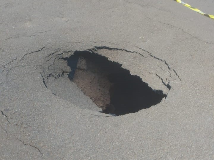 Conforme as informações, o buraco se abriu na tarde deste sábado, entre as duas pistas da avenida, no cruzamento com a Rua Santa Cruz.