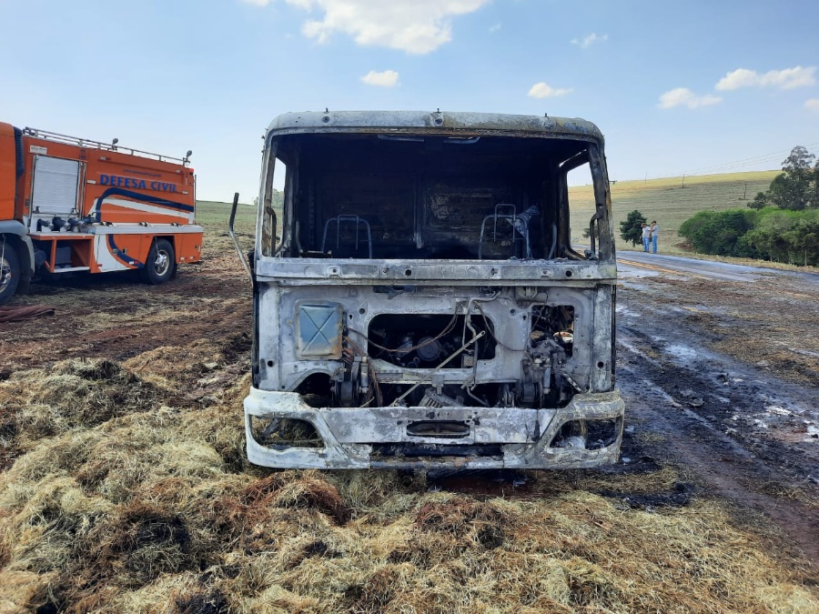 Um caminhão de Toledo foi consumido por um incêndio no início da tarde desta sexta-feira (4), na rodovia estadual PR-585, no trecho que liga São Pedro do Iguaçu a Vera Cruz do Oeste.