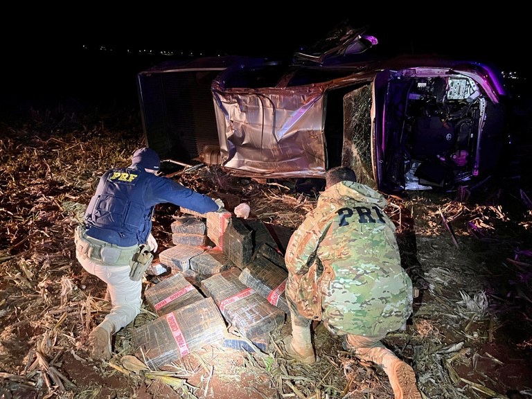 Após dez quilômetros em fuga, o condutor entrou em uma área de lavoura em alta velocidade e capotou a caminhonete. O motorista fugiu a pé em meio à mata fechada e não foi localizado.