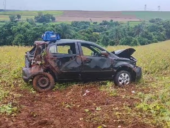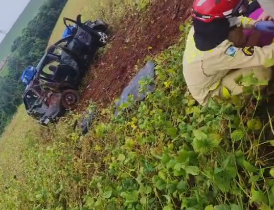 No capotamento, o veículo, que era ocupado por quatro pessoas, caiu em um barranco e parou dentro de uma lavoura.
