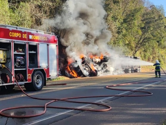 Após o tombamento, o caminhão pegou fogo. O motorista conseguiu sair a tempo, antes que as chamas consumissem o veículo. O homem, que é o dono do caminhão, não se feriu.