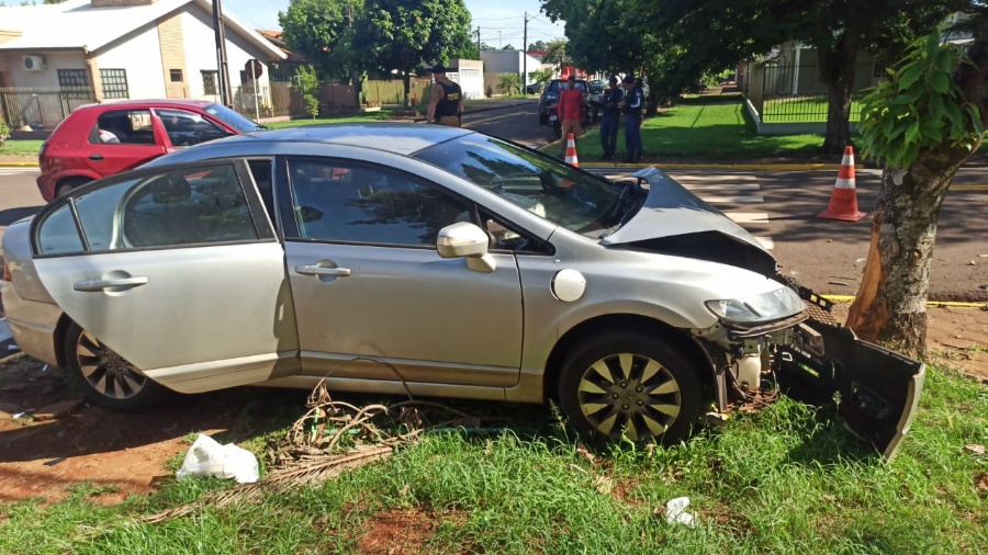Após a colisão, o Honda Civic avançou sobre a calçada e atingiu uma árvore.