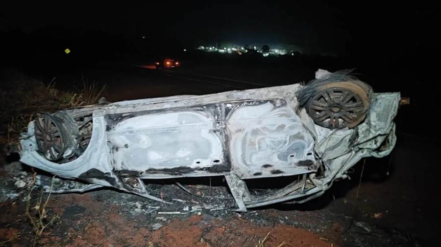 Um carro pelo fogo e ficou destruído após um acidente an PR-239, na noite de domingo (08), entre Quatro Pontes e Novo Sarandi, distrito de Toledo.