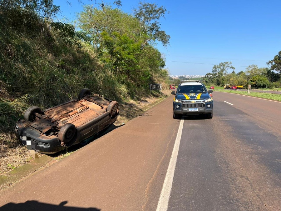 Conforme as informações, um Fiat Palio capotou após colidir com uma carreta. Os veículos seguiam em direção a Cascavel e, após a colisão, o carro atravessou o canteiro, colidiu em um barranco e capotou na pista contrária.