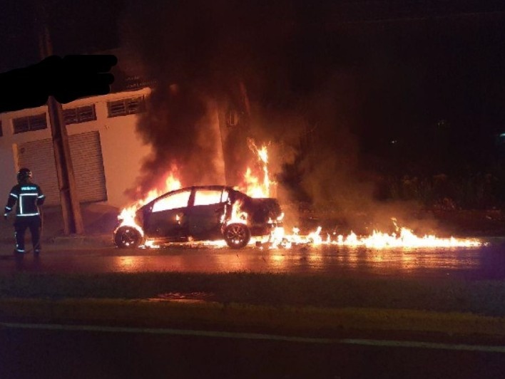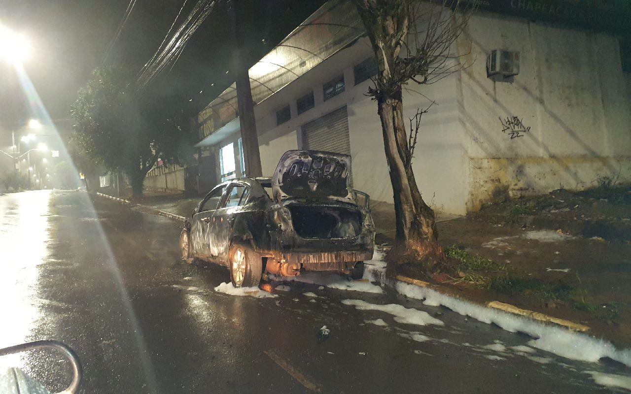 A Guarda Municipal foi acionada e isolou a área até a chegada do Corpo de Bombeiros, que combateu o fogo. O carro ficou destruído e o incêndio também atingiu uma árvore.
