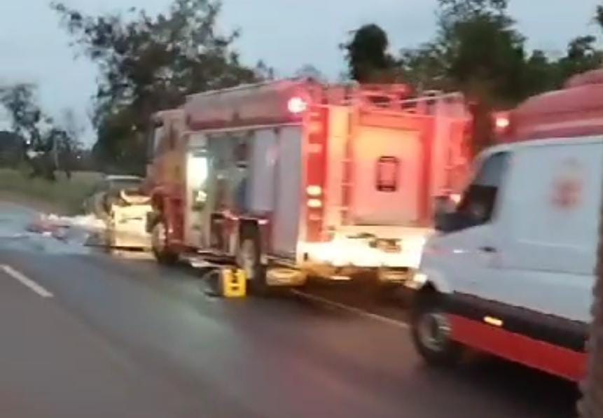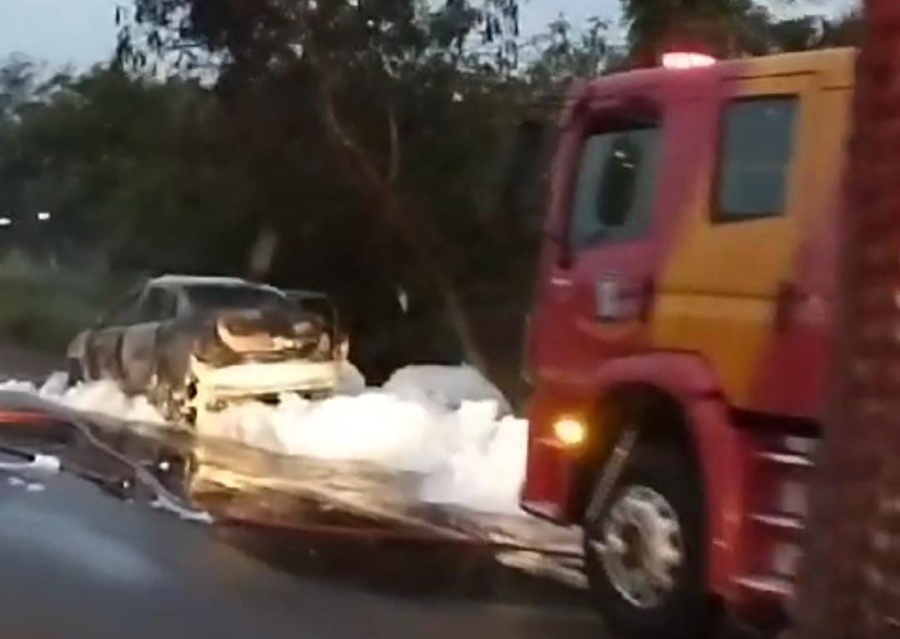 Um carro pegou fogo e ficou totalmente destruído na Rodovia BR-467, em Toledo, no início da noite desta quarta-feira (27).