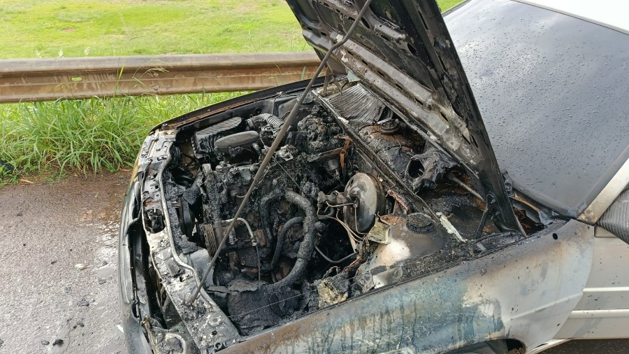 O motorista e outros populares tentaram conter o fogo com extintores até a chegada dos bombeiros, que controlaram as chamas.
