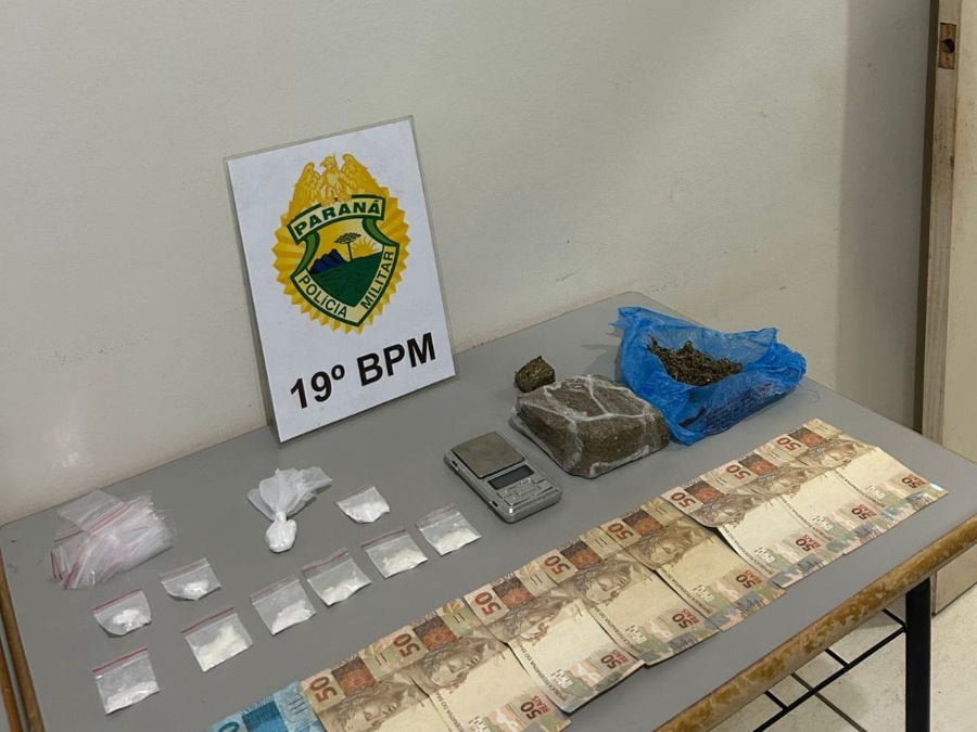 Um homem e sua esposa foram conduzidos à delegacia após a Polícia Militar localizar grande quantidade de drogas, dinheiro e materiais para fracionamento em uma residência no bairro Panorama, em Toledo, na noite de quinta-feira (15).