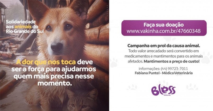 Para obter mais informações e participar da campanha, você pode acessar o link: https://www.vakinha.com.br/vaquinha/sos-pet-enchente-no-rio-grande-do-sul ou entrar em contato pelo número (44) 9-9723-7011 - Fabiana Puntel.