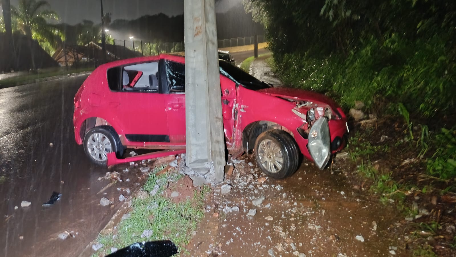 De acordo com informações repassadas pelas autoridades, o condutor de um Renault Sandero seguia pela via quando, por razões ainda não esclarecidas, perdeu o controle da direção e atingiu diretamente a estrutura. O impacto foi suficientemente forte para comprometer a base do poste, que sofreu danos significativos, mas não chegou a tombar.