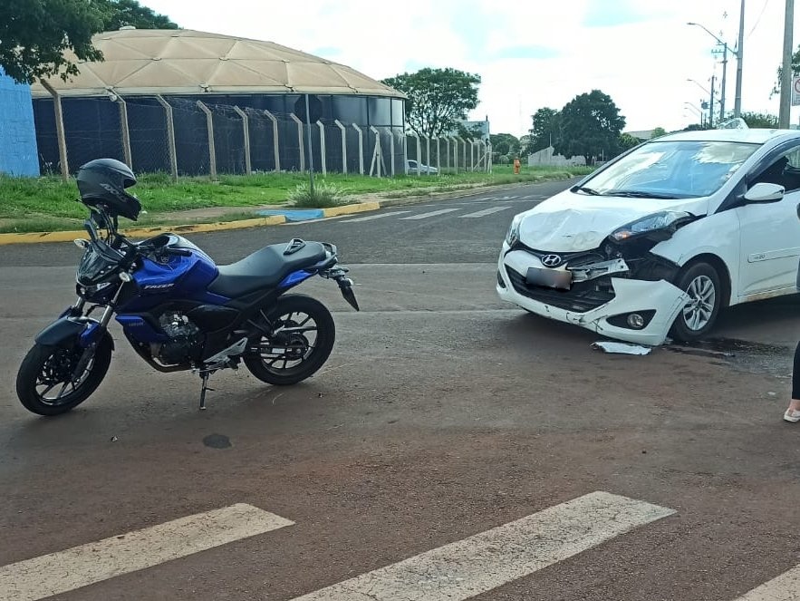 Um acidente envolvendo um Hyundai HB20 e uma Yamaha FZ15 deixou um motociclista ferido na tarde desta terça-feira (05) no cruzamento da Rua Mário Fontana com a Rua João Roland, no bairro Jardim Panorama.