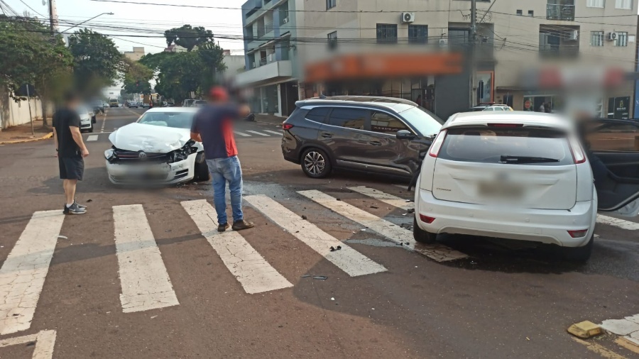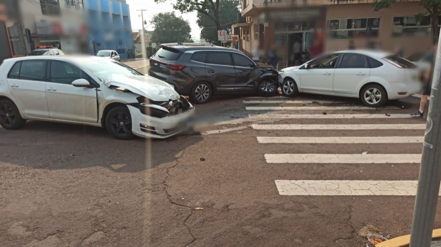 Uma colisão envolvendo três veículos deixou uma criança e um adulto feridos na manhã desta terça-feira (24) em Toledo. O acidente aconteceu no cruzamento da Rua Santos Dumont com a Rua Piratini, na área central da cidade.