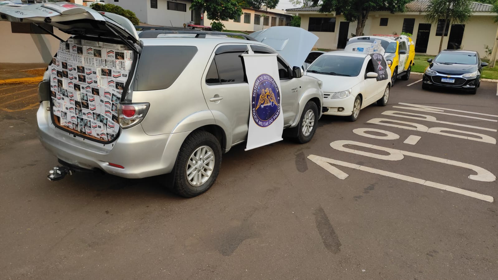 Com as coordenadas repassadas pelo helicóptero, as equipes em terra fizeram o adentramento tático na residência, mas não encontraram ninguém no local. Ao verificar os veículos, constataram que se tratava dos mesmos denunciados e que estavam carregados com cigarros de marcas diversas.