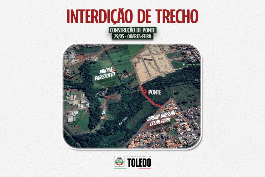 A Secretaria da Infraestrutura Rural e Urbana e de Serviços Públicos (Infra) informa que fará a interdição do prolongamento da Rua Maria Parize a partir desta quarta-feira (29). A medida tem o objetivo de garantir a segurança para a montagem do canteiro de obras e dos colaboradores que estarão envolvidos na construção da ponte de concreto sobre o Rio Toledo.