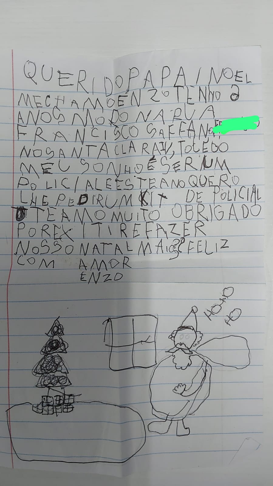 Enzo, de 6 anos, escreveu uma cartinha ao Papai Noel pedindo um Kit Policial de presente. O menino é morador do Jardim Santa Clara, em Toledo.