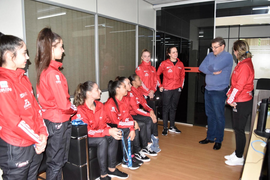 A equipe da Associação de Ginástica Toledana (Agito) foi recebida pelo prefeito de Toledo na tarde desta terça-feira (18), após conquistar o título de campeã geral por equipe no Campeonato Brasileiro Adulto de Ginástica em Campo Grande/MS, realizado entre 28 de junho e 2 de julho. As ginastas Geane Silva, Samara Sibin e Maria Eduarda Alexandre, sob o comando da técnica Solange Paludo, somaram as maiores notas nos aparelhos arco, bola, maças e fita.