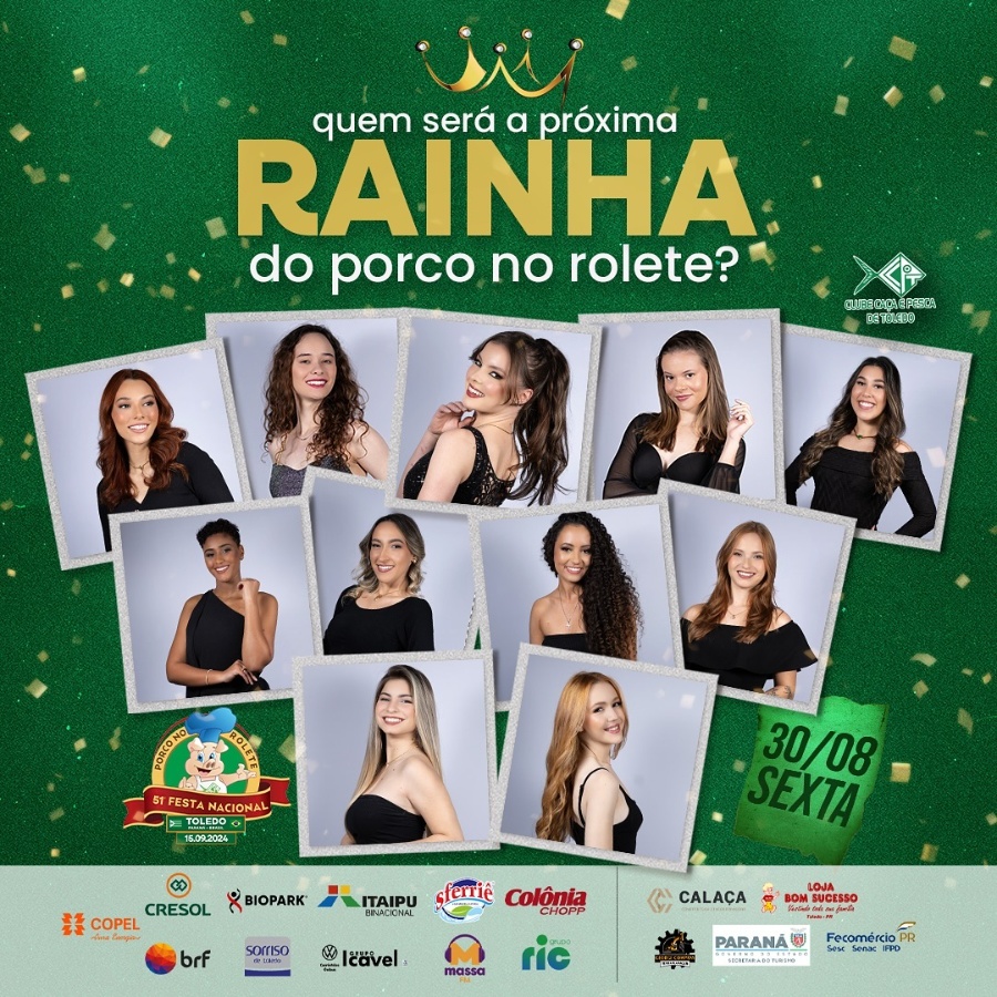 Onze mulheres disputam o título de Rainha da 51ª Festa Internacional do Porco Assado no Rolete, em Toledo. O evento inicia a partir das 20h, desta sexta-feira (30).