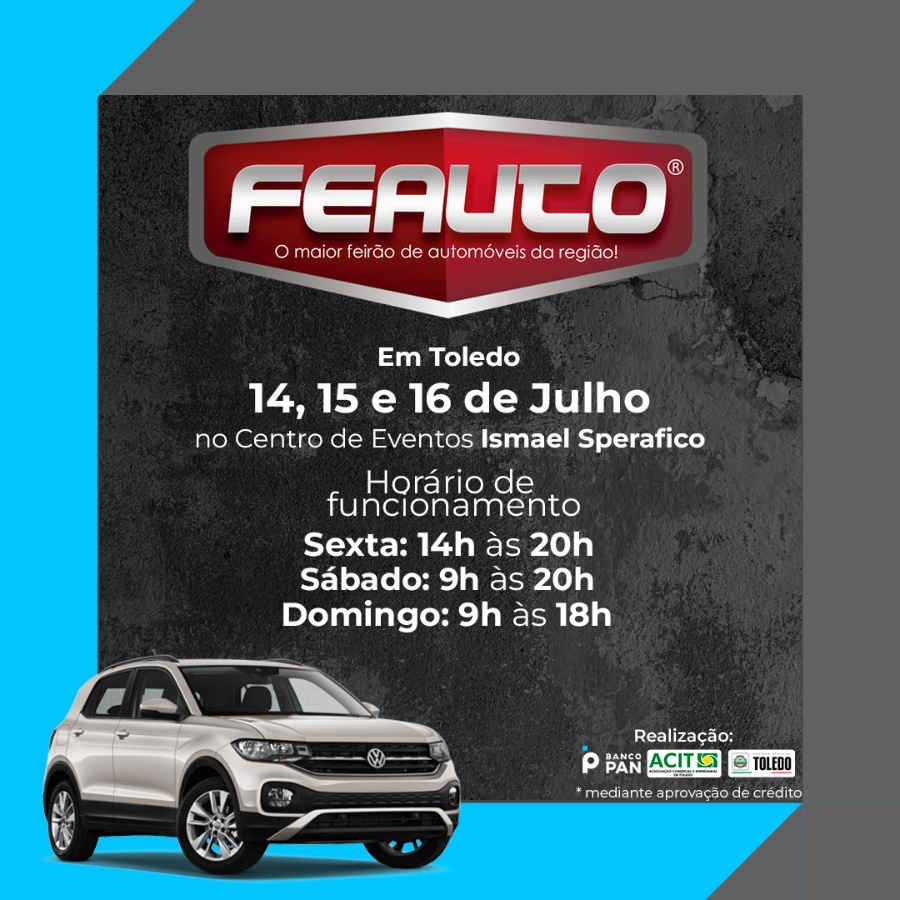 A Feira de Automóveis de Toledo (Feauto), promovida pelo Banco Pan em parceria com a Associação Comercial e Empresarial de Toledo (ACIT), começa na sexta-feira (14) e vai até o domingo (16), no Centro de Eventos Ismael Sperafico.