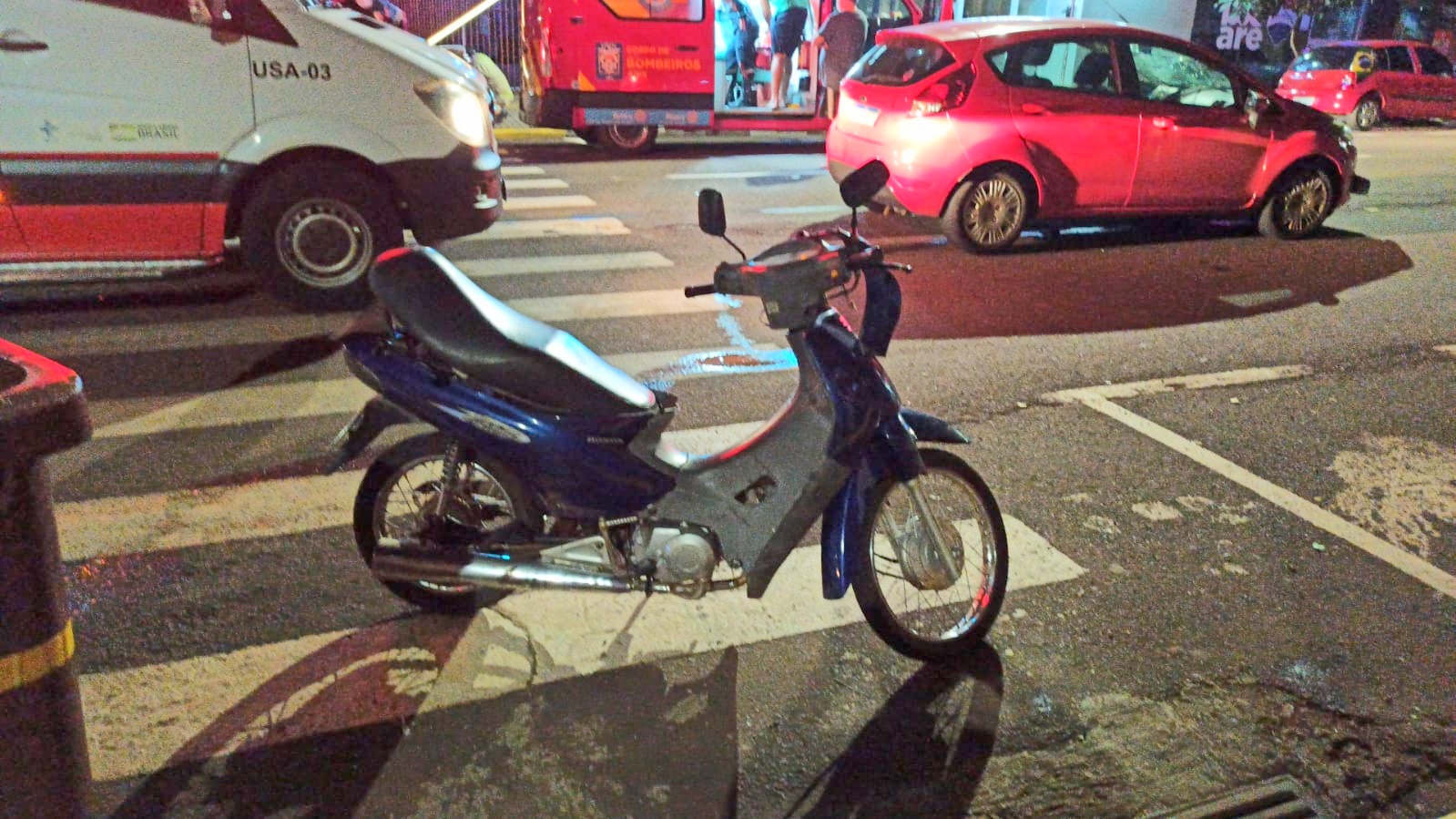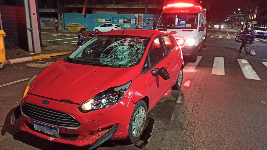 Uma mulher grávida de 25 anos ficou gravemente ferida após uma colisão entre um carro e uma moto na noite de quarta-feira (20), no centro de Toledo.