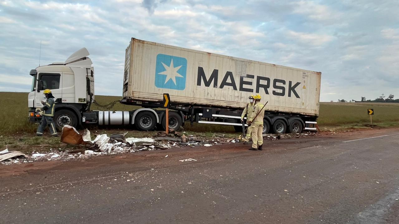 Uma terceira carreta, que seguia no mesmo sentido da carreta container, precisou realizar uma manobra brusca para evitar a colisão com os veículos acidentados, saindo da pista.