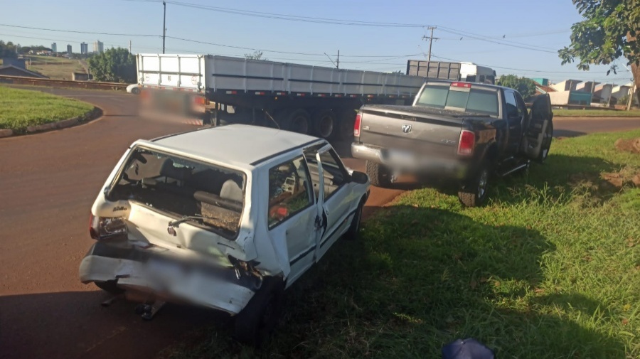 ma colisão traseira entre uma caminhonete Dodge RAM 2500 e um Fiat Uno foi registrada no final da tarde desta terça-feira (17) no trevo da rodovia PR-585 com a avenida Egídio Jerônimo Munaretto, na saída de Toledo para São Pedro do Iguaçu.