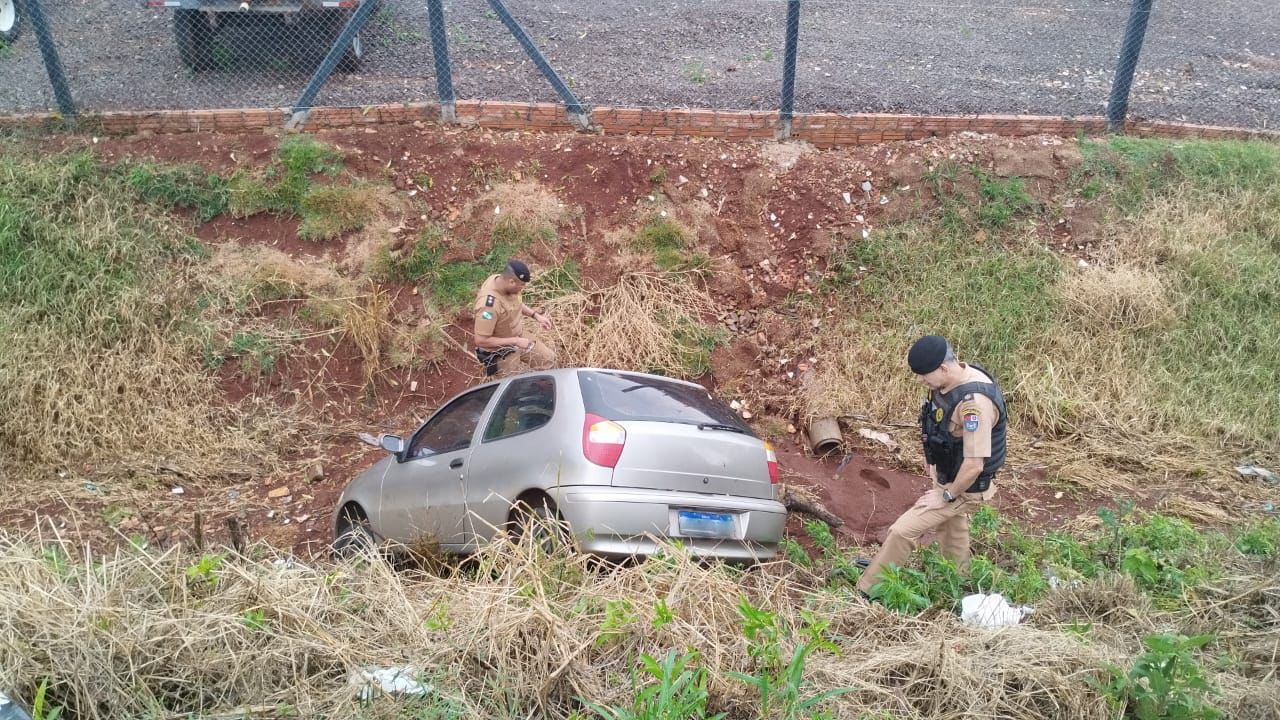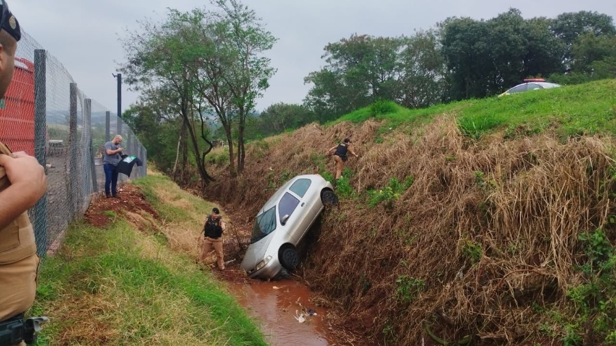 Posteriormente, o Fiat/Palio foi localizado caído em um barranco. O carro foi levado à Delegacia.