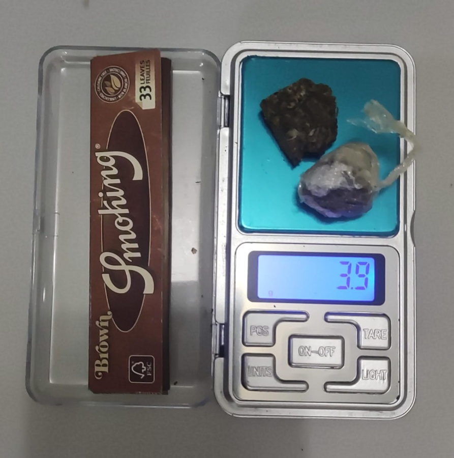 Diante da atitude suspeita, foi realizada a abordagem e revista pessoal ao homem. No bolso esquerdo, os policiais localizaram duas porções de substância análoga à maconha, parcialmente deterioradas pela tentativa de "esfarelar" o conteúdo (pesando 4 gramas), prontas para consumo e/ou distribuição.