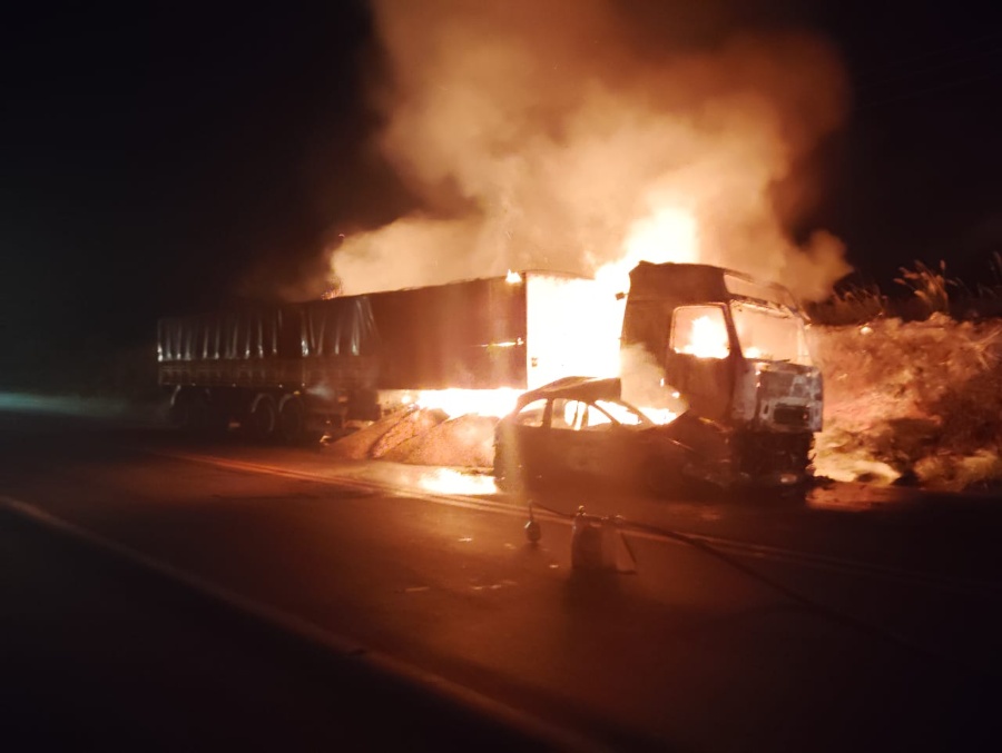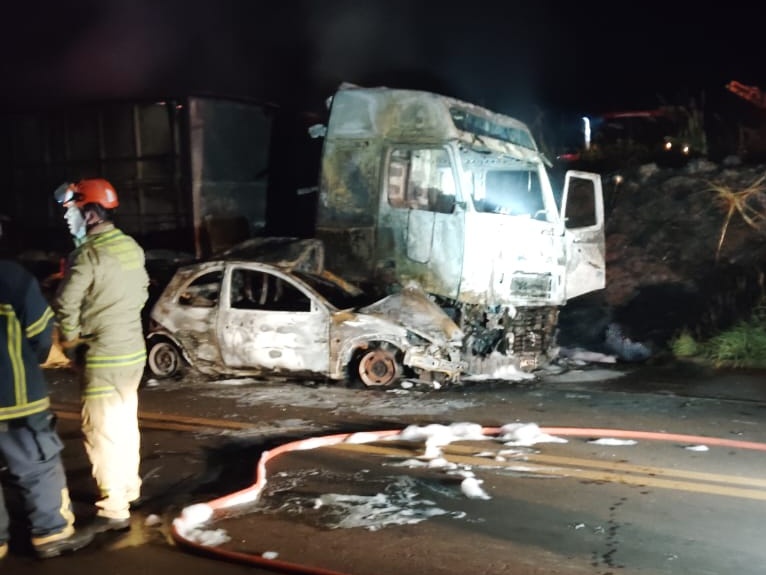 Com a violência do impacto, o carro ficou preso no caminhão e foi arrastado por 200 metros, se incendiando na sequência. O fogo se alastrou e tomou conta de ambos veículos.