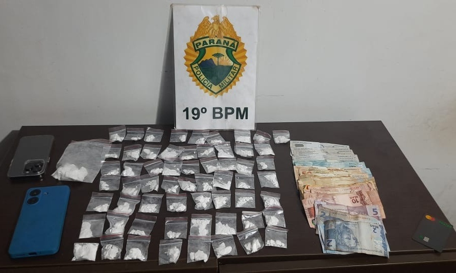 A fuga terminou quando ele entrou no pátio de sua casa na rua Capitão Leônidas Marques e abandonou a moto. Ele foi perseguido e detido pela equipe policial, que encontrou em sua carteira duas porções de cocaína, pesando cerca de 2 gramas, e uma quantia em dinheiro.