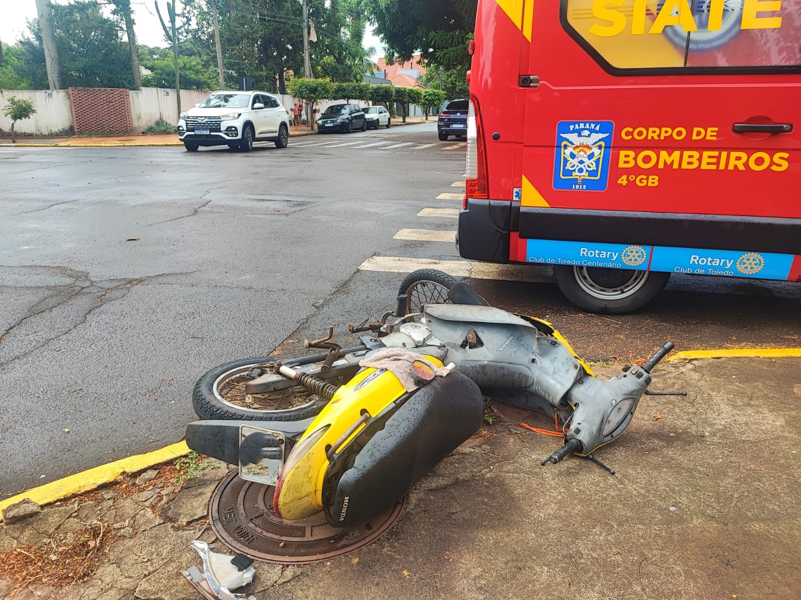 Um acidente de trânsito foi registrado na tarde desta quarta-feira (17), na esquina da Rua Sete de Setembro com a Rua Bomfim, no centro de Toledo. Um jovem ficou ferido.
