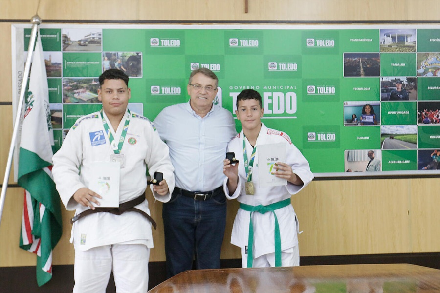Os judocas Samuel Canodá (12) e João Pedro da Cruz Paz (15) foram recebidos, juntamente com seus mestres e familiares, na Sala de Reuniões do Gabinete do Prefeito de Toledo na manhã desta terça-feira (16). Os jovens foram homenageados pelo prefeito e pelo secretário de Esportes e Lazer em reconhecimento ao desempenho de ambos no Campeonato Brasileiro de Judô - Região V, realizado em Curitiba nos dias 05 e 06 de abril.