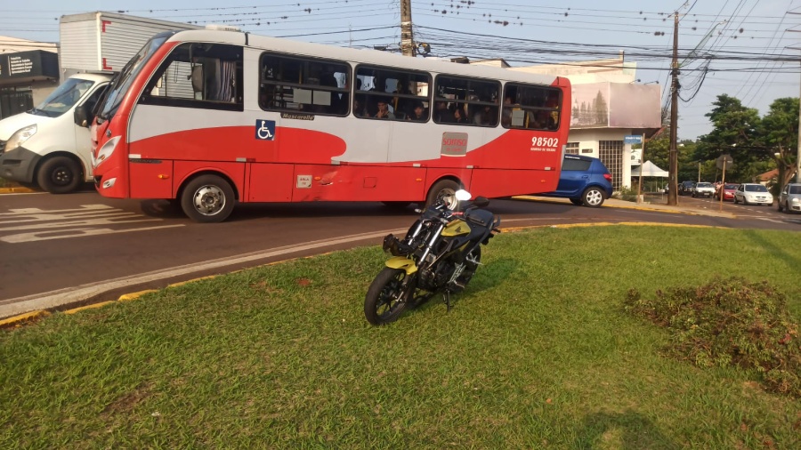 Um acidente entre um ônibus e uma moto deixou um motociclista ferido na manhã desta terça-feira (15), em Toledo. O acidente ocorreu na rotatória da Rua dos Pioneiros com a Avenida Senador Atílio Fontana, no Jardim Bressan.
