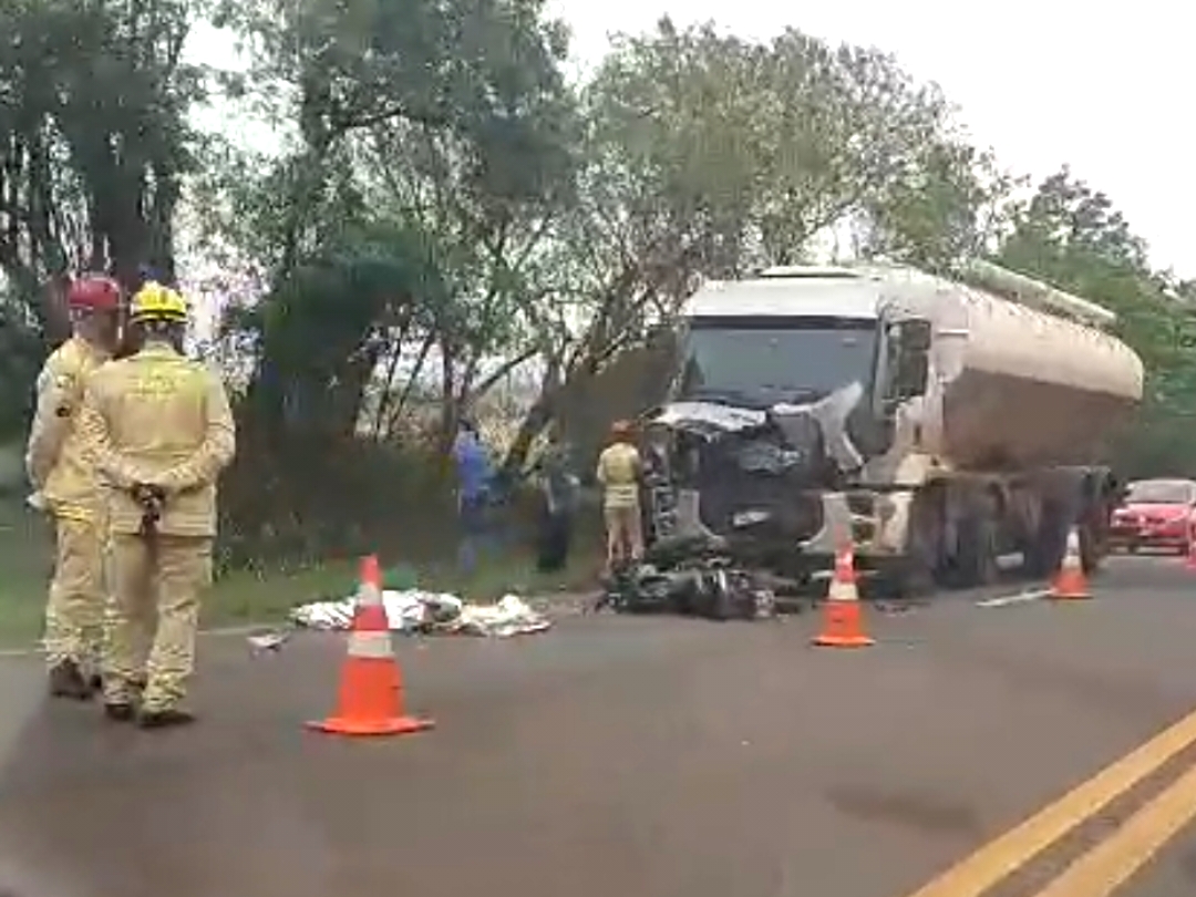 O condutor da moto, que seguia em direção a Toledo, bateu de frente com o caminhão, que seguia no sentido contrário.