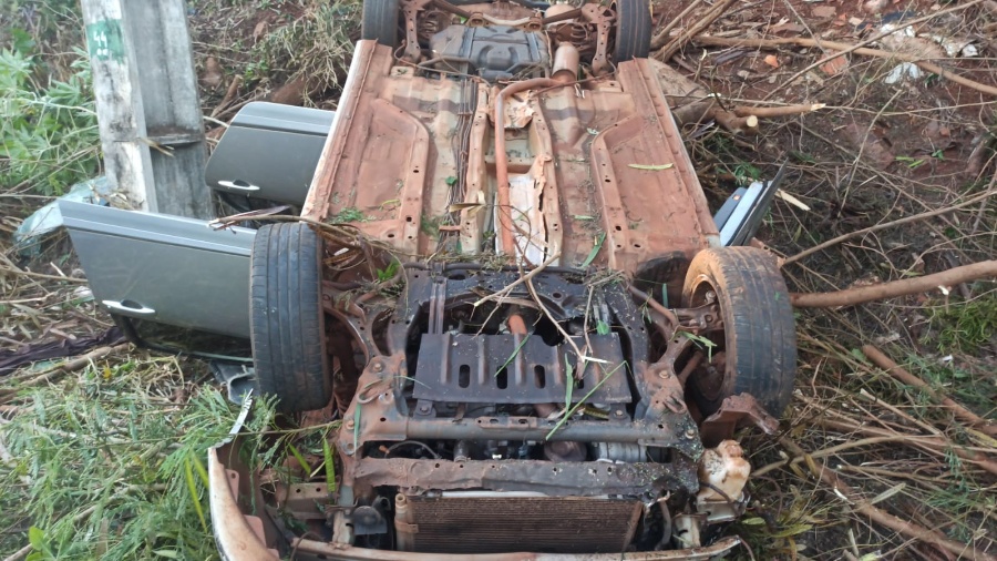 Um Honda Civic capotou na manhã deste sábado (1º), após o condutor perder o controle na rotatória da Avenida Egídio Jerônimo Munaretto com a Rodovia PR-585.
