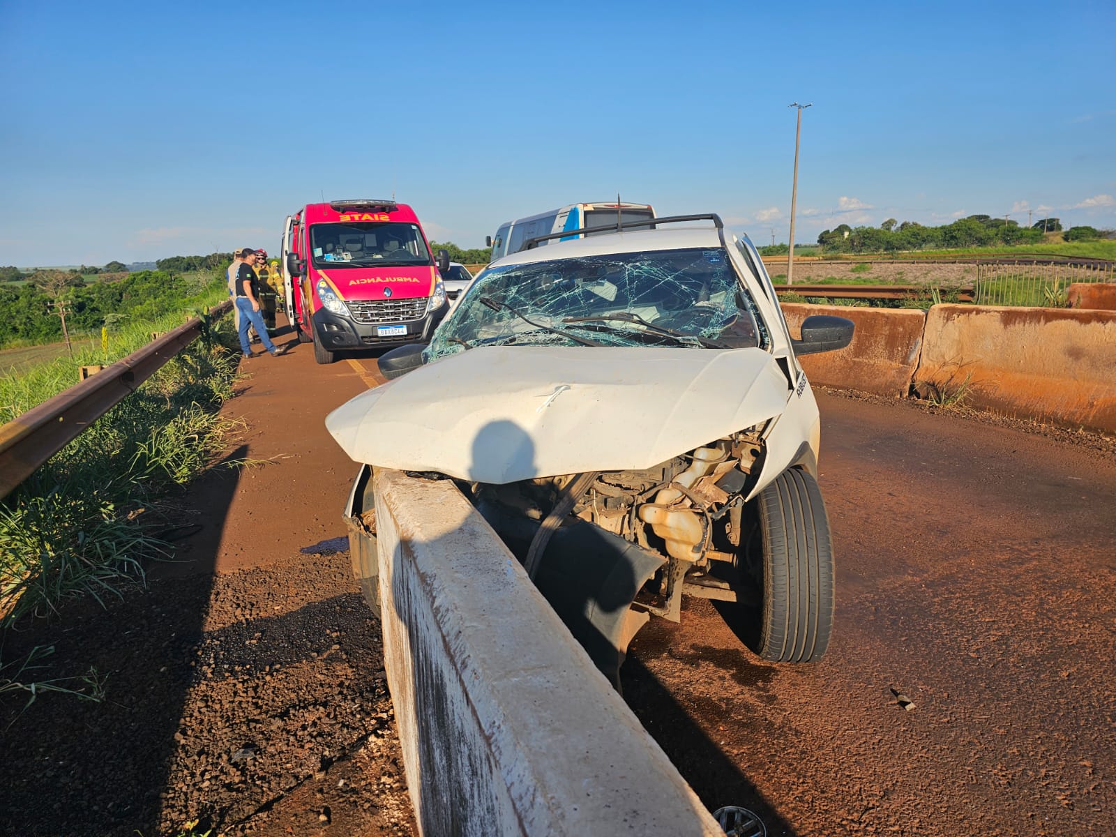 O condutor de uma picape VW Saveiro, que seguia de Cascavel para Toledo, colidiu com a mureta de proteção do viaduto. Segundo informações, o sol forte teria ofuscado a visão do motorista.