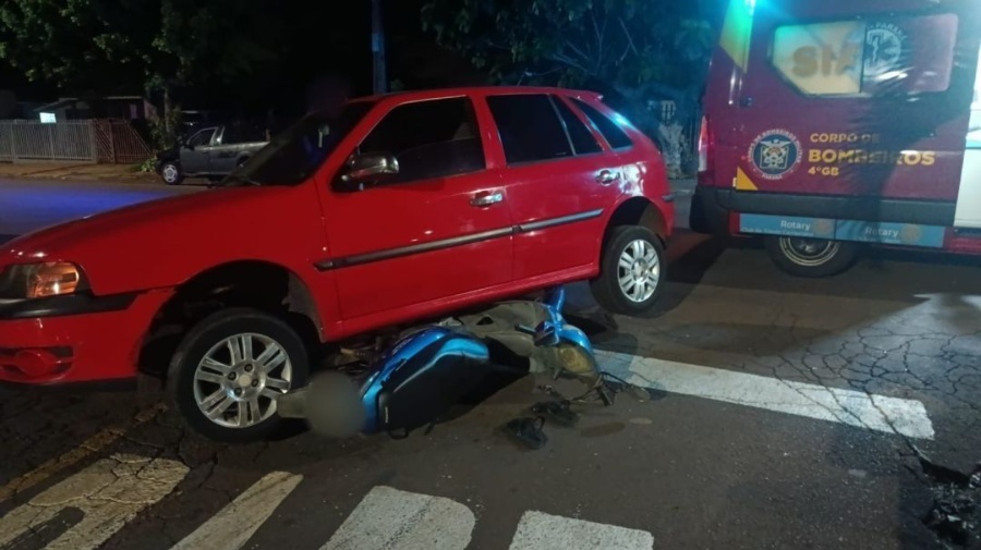 No encontro das vias, ocorreu o choque entre os veículos, fazendo com que a motocicleta fosse parar embaixo do carro. A situação exigiu atendimento imediato das equipes de socorro.