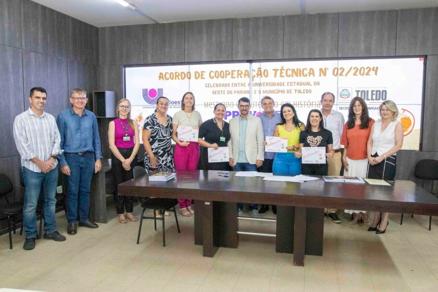 Na manhã desta segunda-feira (18), a Secretaria da Educação de Toledo (Smed) foi palco de um importante avanço para os servidores públicos da área de educação. Foi assinado o Acordo de Cooperação Técnica nº 002/2024 entre o Município de Toledo e a Universidade Estadual do Oeste do Paraná (Unioeste). O acordo prevê a concessão de seis bolsas de mestrado e três de doutorado exclusivas para profissionais da rede municipal de ensino, através do Programa de Pós-Graduação em História do câmpus Marechal Cândido Rondon da Unioeste.