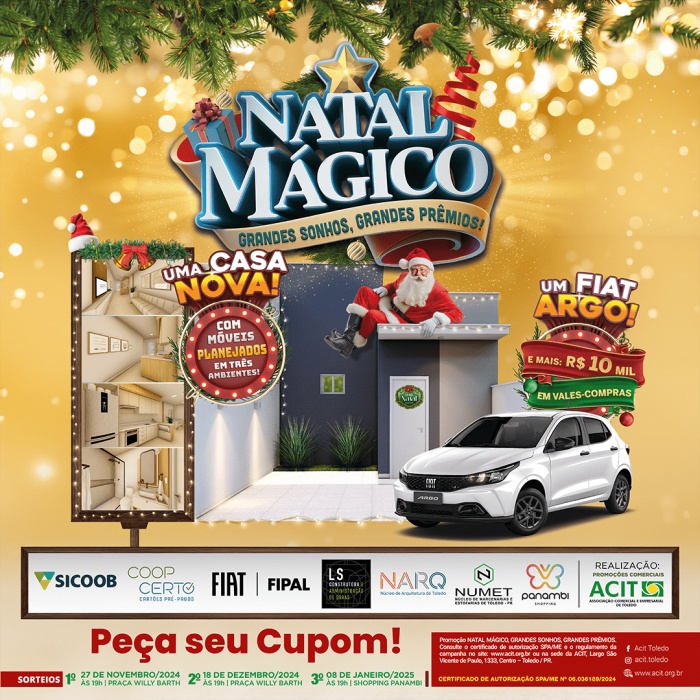A campanha "Natal Mágico, Grandes Sonhos, Grandes Prêmios", promovida pela ACIT em Toledo, oferece a chance de ganhar uma casa nova no Residencial Imbuia. A residência, com dois quartos, sala, cozinha, banheiro e área de serviço, terá ainda cozinha planejada, painel para TV e balcão de banheiro, produzidos por marcenarias locais.