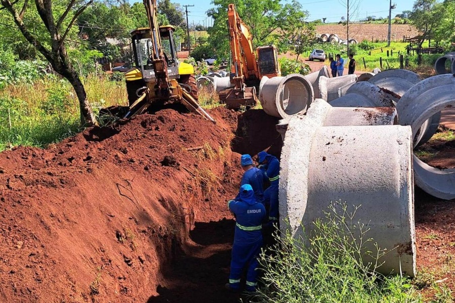A Empresa de Desenvolvimento Urbano e Rural (Emdur), órgão da Prefeitura de Toledo, está executando a obra de emissário de galerias pluviais em Novo Sarandi. O objetivo é melhorar o escoamento da água da chuva na Região Sul do distrito. O investimento é de mais de R$ 935 mil e a extensão é de 940 metros de tubos de 1,20 metro de diâmetro.