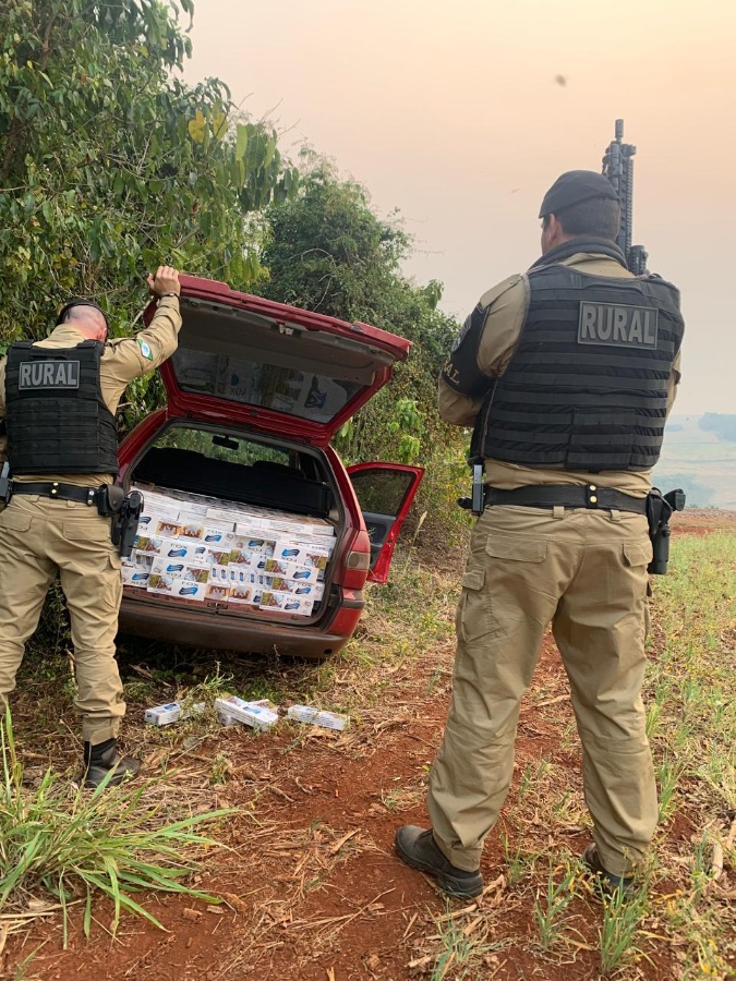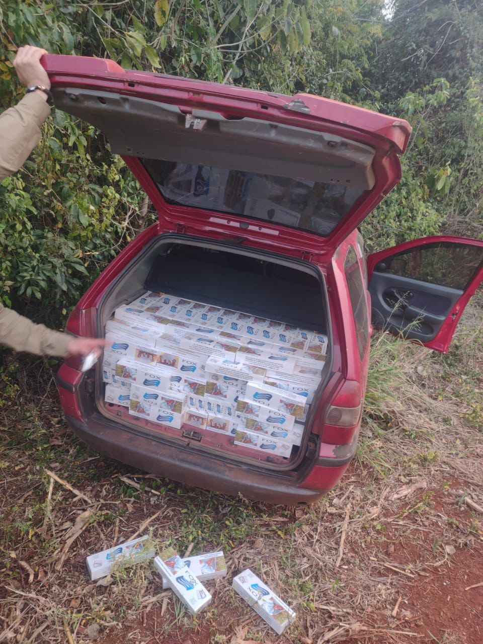 No interior do veículo, foram encontradas aproximadamente 11 caixas de cigarros contrabandeados do Paraguai.