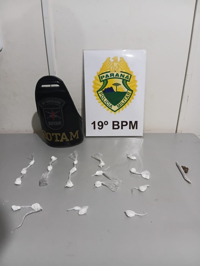 Durante buscas no terreno, os policiais encontraram, em uma peça de roupa no varal da residência dos fundos, 19 porções de substância análoga à cocaína, que totalizaram 11,8 gramas. O abordado afirmou que a droga pertencia aos moradores denunciados e disse que residia no imóvel havia poucos dias.